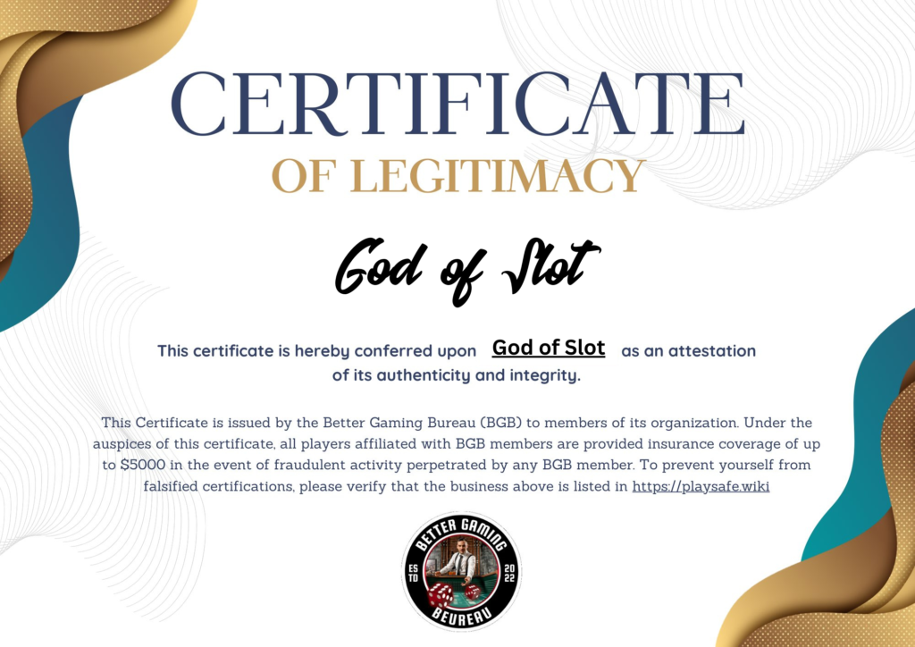 Gof of Slotis now certifiedbyBetter Gaming Bureau This Certificate is issued by the Better Gaming Bureau (BGB) to members of its esteemed organization. Under the auspices of this certificate, all players affiliated with BGB members are provided insurance coverage of up to $5000 in the event of fraudulent activity perpetrated by any BGB member.